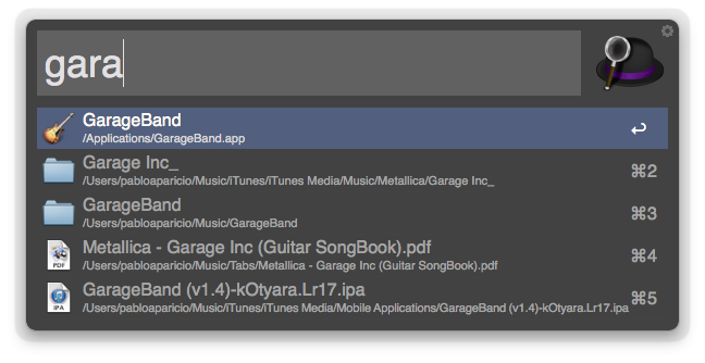 Al igual que las aplicaciones mencionadas, Alfred 2 te irá ofreciendo resultados desde el momento en que empiezas a escribir letras. Como podéis ver en la captura, la primera opción (intro) es la aplicación GarageBand, seguida de las carpetas que empiezan con gara- o un PDF que tengo con las partituras de un disco de MetallicA en PDF. Aquí se terminan las similitudes con el resto de aplicaciones como spotlight…