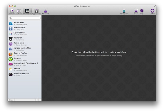 Ah, no. Me dejo mi parte favorita ツ los flujos de trabajo o “workflows”. Con Alfred 2 se pueden crear flujos de trabajo, por lo que también sustituiría a automator. Lo mejor de todo es que existe una comunidad para ello, en Alfred 2 Workflow List, y hay montones de flujos de trabajo ya preparados para usarlos cuando los necesitemos. Por ejemplo, se puede escribir un tweet directamente en el cuadro de diálogo, ver la previsión meteorológica, encontrar una alternativa a una aplicación en la web de AlternativeTo u ocultar/mostrar los archivos ocultos. Las posibilidades son infinitas.