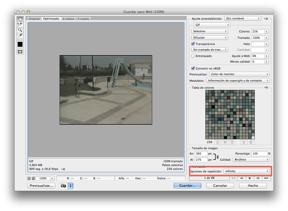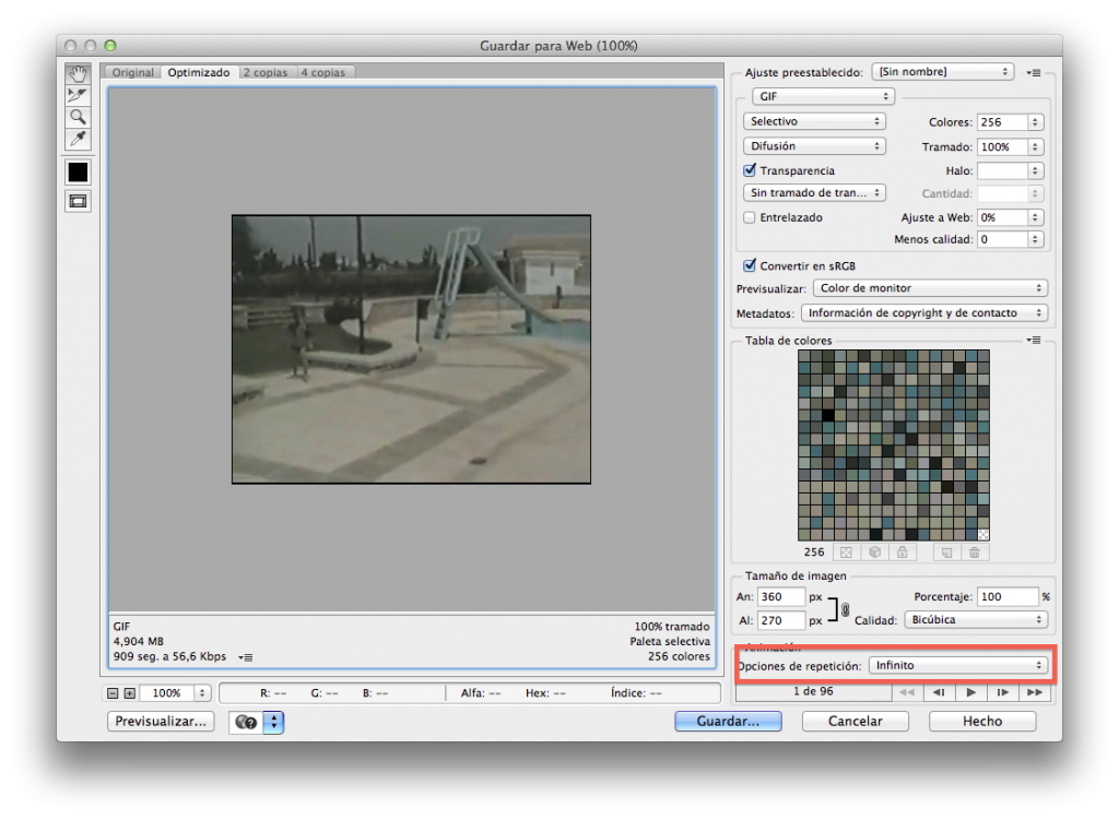 - En este apartado podemos seleccionar el tamaño final del GIF. A nosotros nos interesa ir a opciones de repetición e indicarle “infinito“. De esta manera, el GIF se reproducirá en bucle.