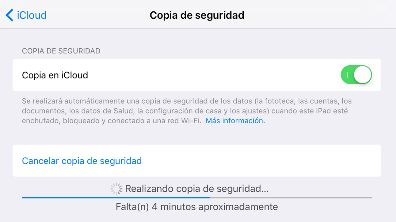 - Vuelve a Ajustes > iCloud > Copia de seguridad y pulsa el botón de “Hacer copia de seguridad ahora”.
