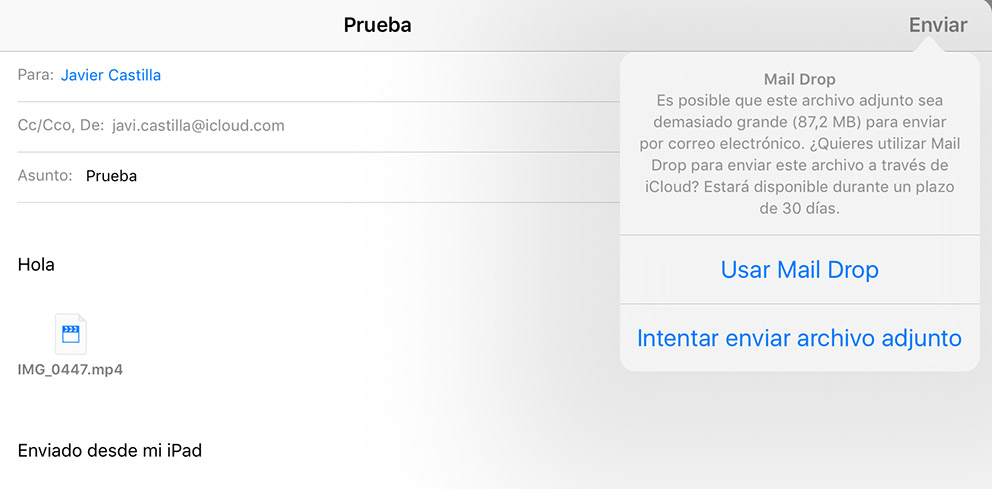 Aún no hemos encontrado en los ajustes del dispositivo ninguna posible configuración para Mail Drop, pero es posible que en futuras versiones de iOS sí aparezca. De momento, lo único que podemos hacer para utilizarlo es seguir es este método y confiar en que su funcionamiento sea el correcto, ya que si adjuntas archivos mientras estás escribiendo el correo, no aparecerá la opción de Mail Drop y te forzará a acortar el vídeo para que queda en 20 MB.