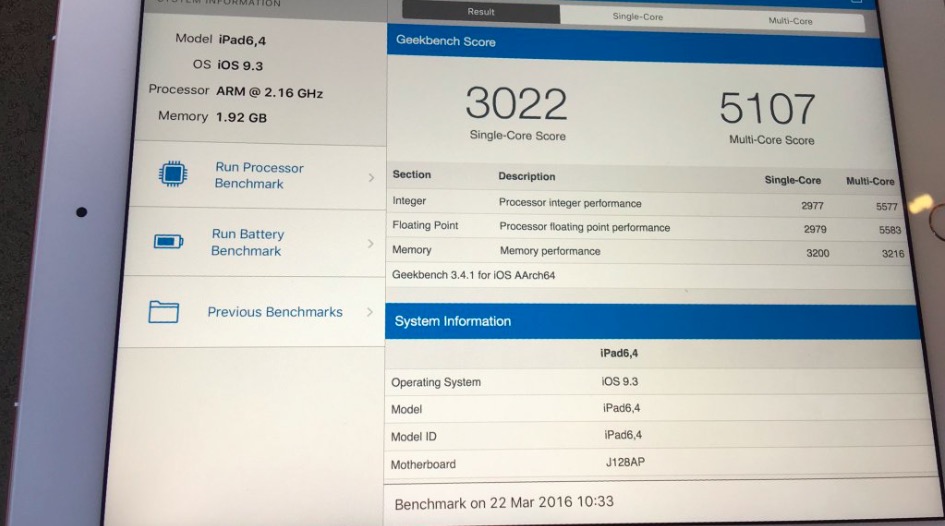 Esto, junto con el descenso de velocidad de frecuencia en el procesador A9X con respecto al iPad Pro de 12,9 pulgadas (2,16 frente a 2,24 GHz) da a este dispositivo un poco menos del rendimiento profesional que cabría esperar de él. De hecho, gracias a unas imágenes subidas por un usuario a Twitter con la aplicación Geekbench hemos podido comprobar el la puntuación de rendimiento exacta que obtiene.